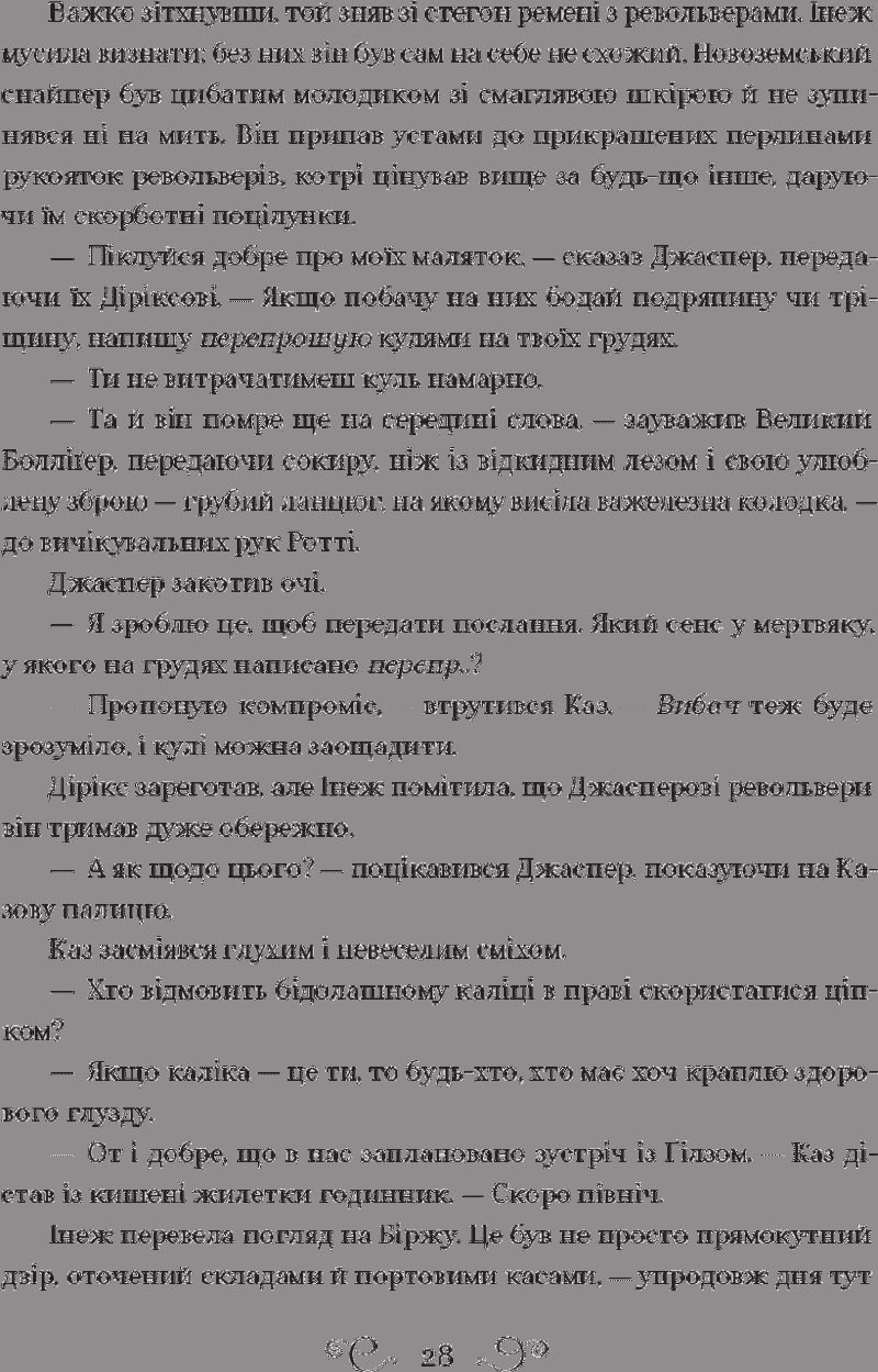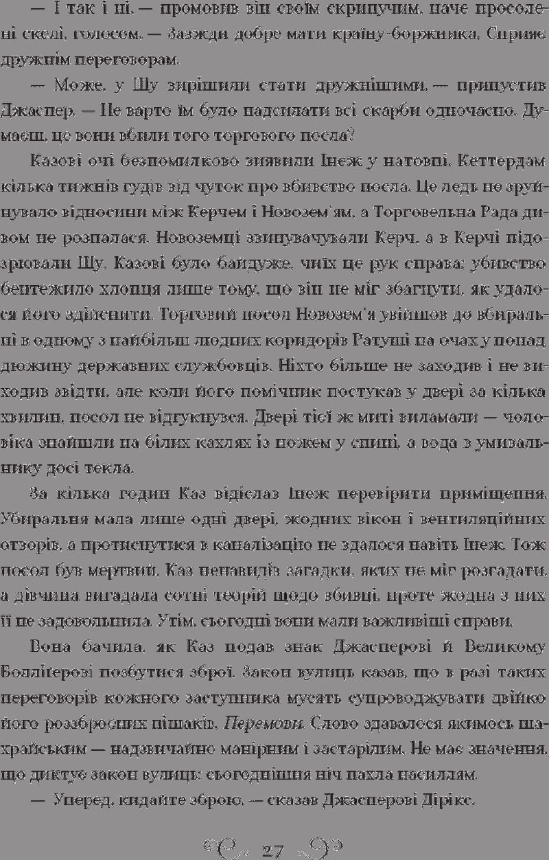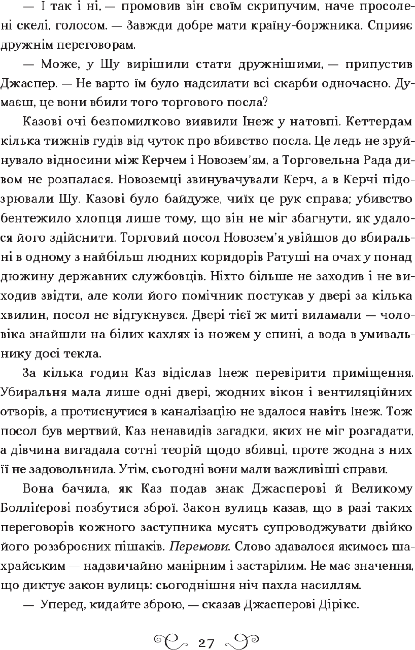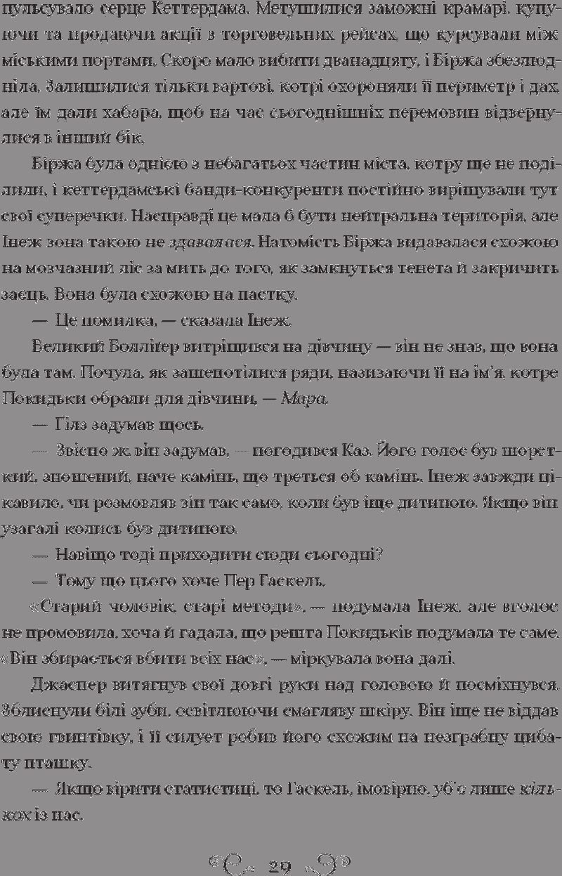 Лі Бардуґо — авторка трилогії про орден Гриша, що стала бестселлером The New York Times. Народилася в Єрусалимі, зростала у Лос-Анджелесі. Закінчила Єльський університет. Займалася рекламою, журналістикою, візажем та спецефектами. Нині живе й пише у Голлівуді, де іноді можна почути виступи її гурту. Кримінальному генію Казу Бреккеру пропонують узятися за смертельно небезпечне викрадення й стати багатшим, ніж у найсміливіших мечтах. Але він не впорається самотужки… Жертва, що спіткала до помсти Стрілець, що не відмовиться від парі Дрюскеле, мисливця за відьмами Шпигунка, знана як Мара Серцетлумачниця, яка вижила в дебрях завдяки власним чарам Крамарик, що розуміється на вибухівці Казова команда — єдине. Якщо вони не повбивають одне одного дорогою до мети.