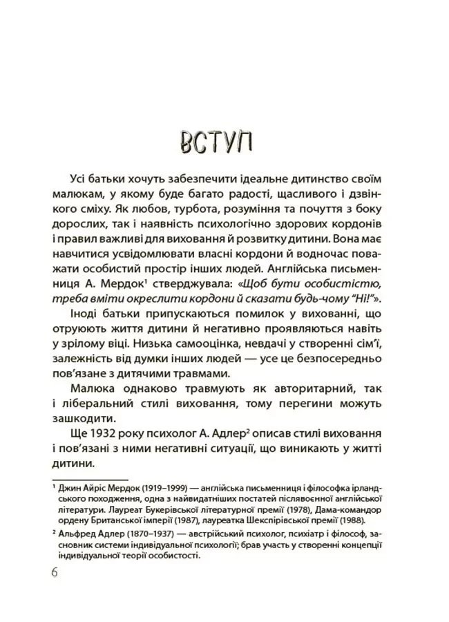 Виховання дітей — складний та тривалий процес. Всі батьки хочуть, щоб їхній малюк виріс вихованим і поважним людиною, яка вміє відстоювати власні кордони та поважати особисті межі інших. Адже від того, як дитина комунікує з оточуючими, залежить її майбутнє життя. Ця книжка допоможе дорослим побудувати гармонійні стосунки у батьківщині, запровадивши розумні, люблячі кордони для дитини, не травмуючи її. Дати відповіді на поширені запитання. – То як навчити дитину дисципліни і водночас не зашкодити психічному та фізичному стану? – Де межа між контролем і насильством, вседозволеністю та розумними кордонами? – Як навчити малюка трохи дорослих? – Як допомогти дитині збудувати власні психологічні межі? – А як дорослим встановити свої? – І взагалі, навіщо межі й кордони в сім’ї?