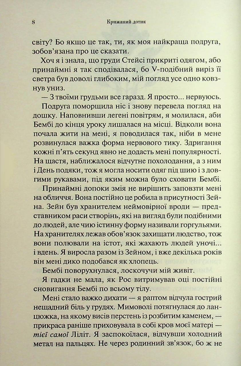 Кожне торкання має свою ціну Лейла намагається зібрати шматки свого розбитого життя. Вона більше не може повністю довіряти клану зберігачів, який завжди захищав її, бо розуміє, що їй не відкривають усієї правди. Все частіше Лейла думає про Роса, дикого й гарячого демона, який розумів її так, як ніхто інший. Силі Лейлі швидко розвиваються, тож вона відчуває спокусливий смак того, що завжди було забороненим. Зовсім неочікувано повертається Рос із новинами, що назавжди змінюватиме її світ. Лейла нарешті отримає те, чого завжди хотіла. Але чи готова вона за це заплатити?