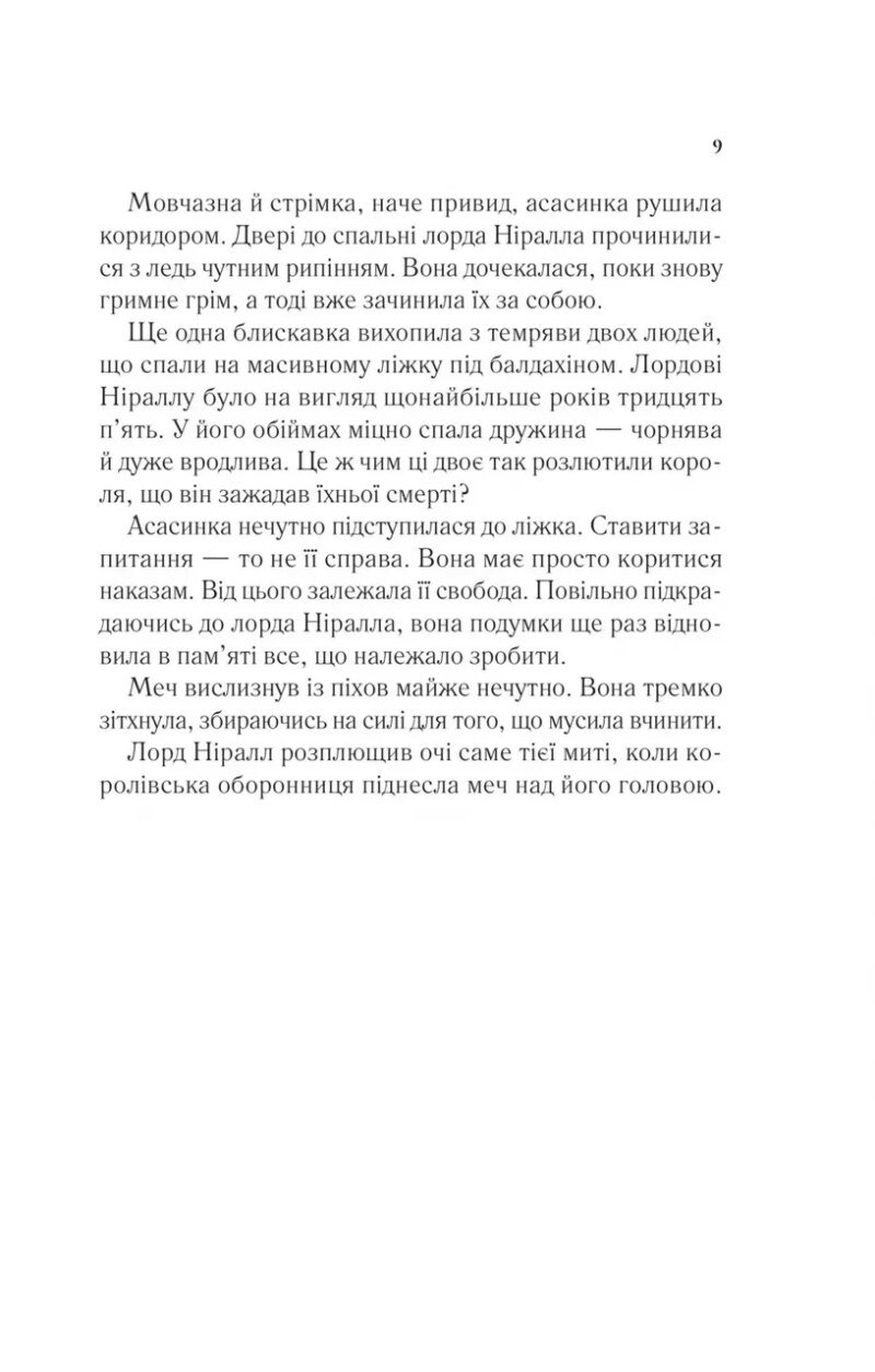 Найбезстрашніший з усіх асасинок Адарлену лише вісімнадцять. Селена — видатна вбивця, якій вдалося виграти небезпечні змагання та здобути титул королівської оборонниці. Втім, їй обіцяли ще й таку омріяну свободу, а натомість дівчина не здатна навіть дати волю своєму серцю. Великого тягаря в неї на душі ще не було: якщо вона холоднокровно вб’є аж такого ненависного їй врага — це означатиме смертельний вирок для всього найдорожчого в її житті. Здавалося б, вибір простий, адже вона вбивця. Та чи має серце вбивця? У всякому разі, Селена буде вирішувати, за що битися: за кохання, за виживання чи за майбутнє королівства.