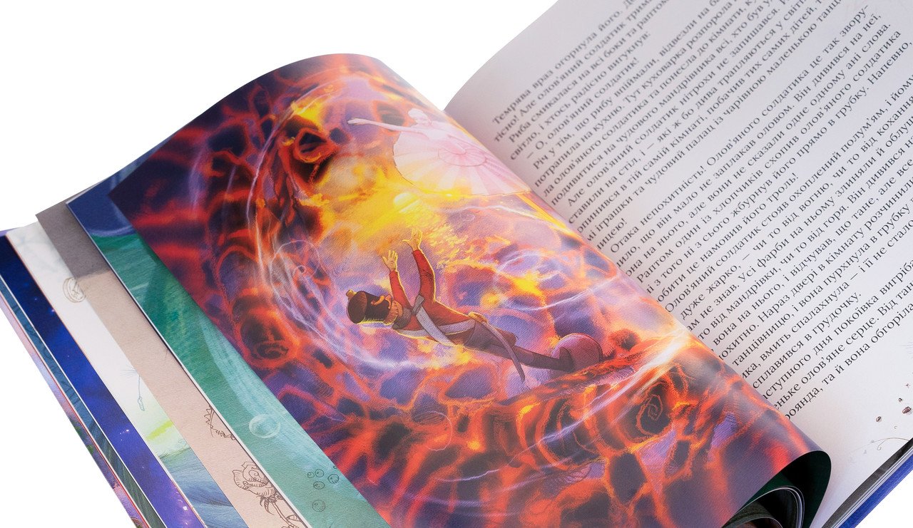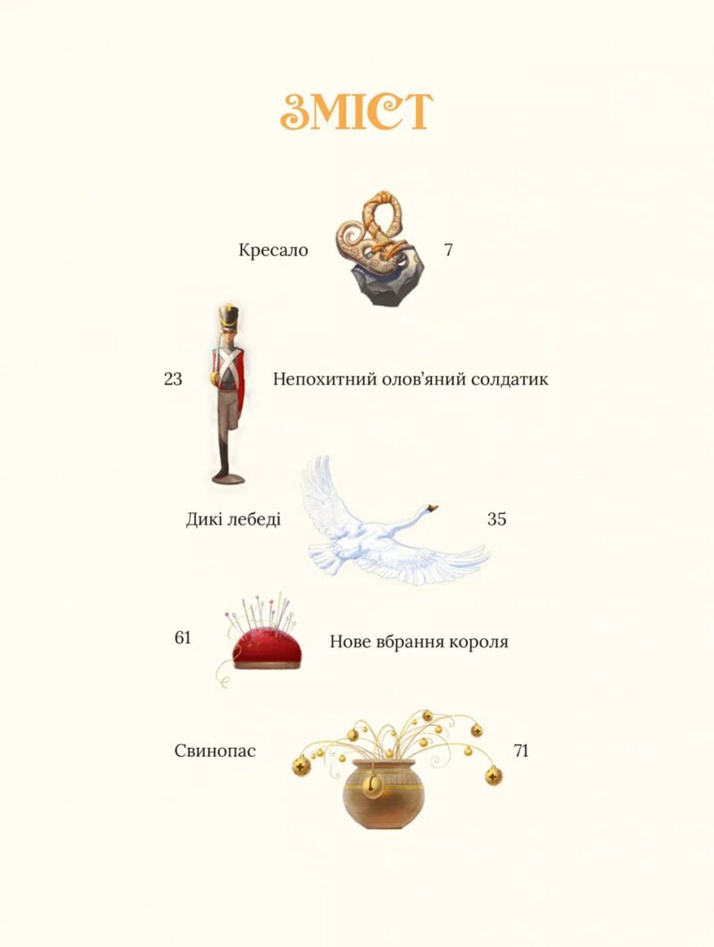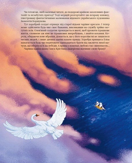 Чи готові ви, любі маленькі читачі, до подорожі країною захоплюючих фантазій та незабутніх пригод? Тоді мерщій розгортайте цю яскраву книжку, ілюстровану фантастичними малюнками відомого українського художника Інокентія Коршунова. Тут хоробрий солдат отримує від старої ведмі чарівне кресало. І тепер може здійснити будь-яке своє бажання, викликавши на службу трійко могутніх псів. Олов’яний солдатик прокидається вночі, щоб прожити іграшкове життя, сповнене аж ніяк не іграшкових випробувань, і знайти кохання. Король, оббираючи нове вбрання, дізнається, що в його королівстві не залишилося чесних людей, і лише дитина здатна казати правду. Хоробра принцеса Еліза намагається будь-що порятувати одинадцятьох братів від закляття лихої мачухи, що обернула їх на лебедів. А принц у пошуках любові стає свинопасом… Чарівна країна казок Ганса Крістіана Андерсена відчиняє свої ворота!