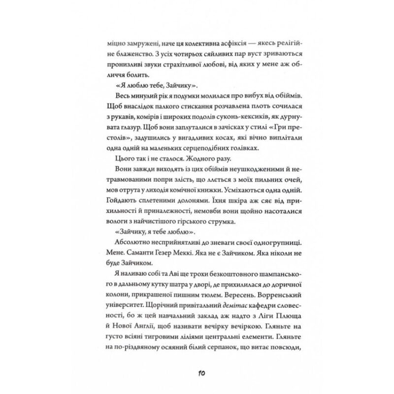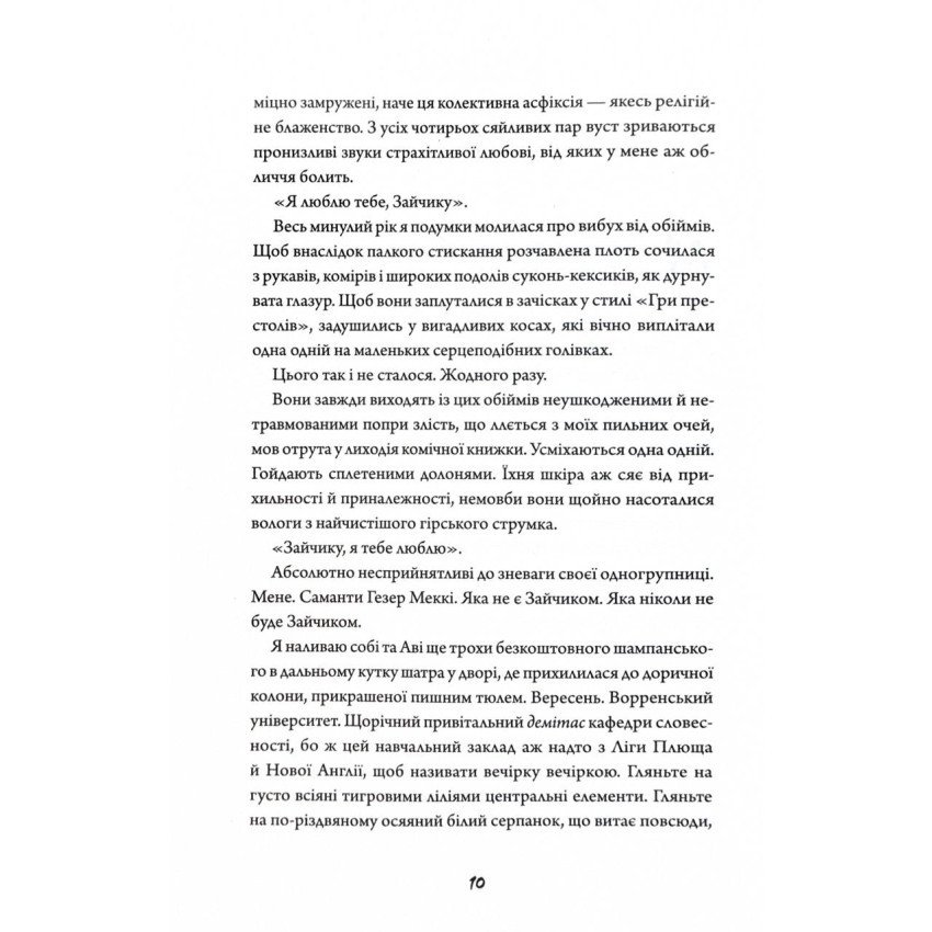 Асоціальна Саманта, студентка елітної програми творчого листа у Ворренському університеті, надає перевагу проводити годину наодинці чи з найкращою подругою Авою. Вона терпіти не може групу претензійних, фальшиво-милих багатих однокурсниць, які називають собі зайчиками і зневажають її. Проте вони несподівано запрошують Саманту на вечірку у свій знаменитий Салон непристойностей. Дівчина з цікавості все ж таки вирішує піти, хоч Ава проти цього. Несподівано Саманту поступово починає приваблювати гламурний і водночас зловісний світ Зайчиків, де темні ритуали із жертвоприношенням дозволяють персонажам студенток оживати. Уява змішується з реальністю, і вже стає важко зрозуміти, де фантазія, а ті страшна правда. Особливо коли результати їх творчих експериментів виходять з-під контролю. Бестселерний «Зайчик» є найкращою книгою 2019 року за версією TIME, Vogue та Нью-Йоркської публічної бібліотеки. Він отримав нагороду від Ladies of Horror Fiction у номінації найкращий роман. Дисертація Моні Авад під час навчання в Єдинбурзькому університеті присвячена страху у казках, тому в творах авторки часто можна знайти ознаки горору. У «Зайчику» вона удало відобразила атмосферу кампусу елітного університету, зобразивши різницю із небезпечним і бідним містом поруч. У тексті багато правдивих моментів, діалогів і думок з письменницької та студентської життя, що робить роман реалістичнішим. А ось образи Зайчиків нагадують персонажів з мультфільмів, що створює разючий контраст між їхньою милою зовнішністю та жорсткими діями. На це також натякає гламурна рожева обкладинка. Ця фантасмагорічна історія розповідає про самотність, дружбу і ті, куди може завести відсутність підтримки. Авторка розкриває такі теми, як зневіра у своєму таланті, психологічну трансформацію та лицемірство, зокрема, у творчому світі. Книга буде подібна до поціновувачів сатиричних оповідей з поєднанням елементів магічного реалізму, фентезі та жахів, які занурюють у психоделічну атмосферу, де важко зрозуміти, де правда, а де вигадка.