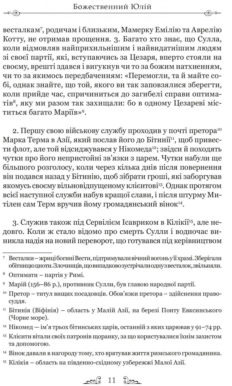 У книжці відомого римського історика Ґая Светонія подано життєписи римських цезарів. Поряд із прикладами мужності, відваги та чесності читач стане свідком неймовірної жорстокості, розпусти, свавілля та жадібності; це, як не дивно, поєднувалося з високими моральними якостями як в окремих особах, так і в римській культурі загалом.Цей давній твір, писаний на початку ІІ ст. існують ницість, підступність та зухвалість. Цікаво спостерігати за тим, як Влада протягом дуже короткої години змінює характер та вдачу людей, неймовірно сильних духом. Залишитися стійкими до її соблазнів, не зловживати своєю посадою, могли тільки нечисленні.