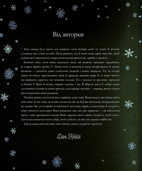 Ця збірка зимових казок — справжній скарб для тих, хто вірить у дива та любить затишні вечори з книгою. На її сторінках оживає чарівний світ, де поруч є люди і казкові істоти, де дерева шепочуть свої історії, а тварини розмовляють людською мовою. Тут герої долають труднощі, творять добро, знаходять друзів і вчаться бачити світ серцем. До книги увійшло 18 найкращих зимових казок зі всього світу — знайомі з детства і нові, сповнені чарівності та тепла. Серед них — «Лускунчик», «Снігова королева», «Рукавичка», «Пуансетія», «Дванадцять місяців», «Король Білий Ведмідь», «Снігуронька» та інші історії, що випромінюють світло надії, любові та доброти. Це атмосферне подарункове видання із чудовими ілюстраціями створене для сімейного читання — для тих теплих зимових вечорів, коли за вікном кружляє сніг, а вдома лунає сміх і пахне гарячим какао. Книга вчити мріяти, вірити в диво і берегти світло у серці, щоби зимові свята стали по-справжньому чарівними.