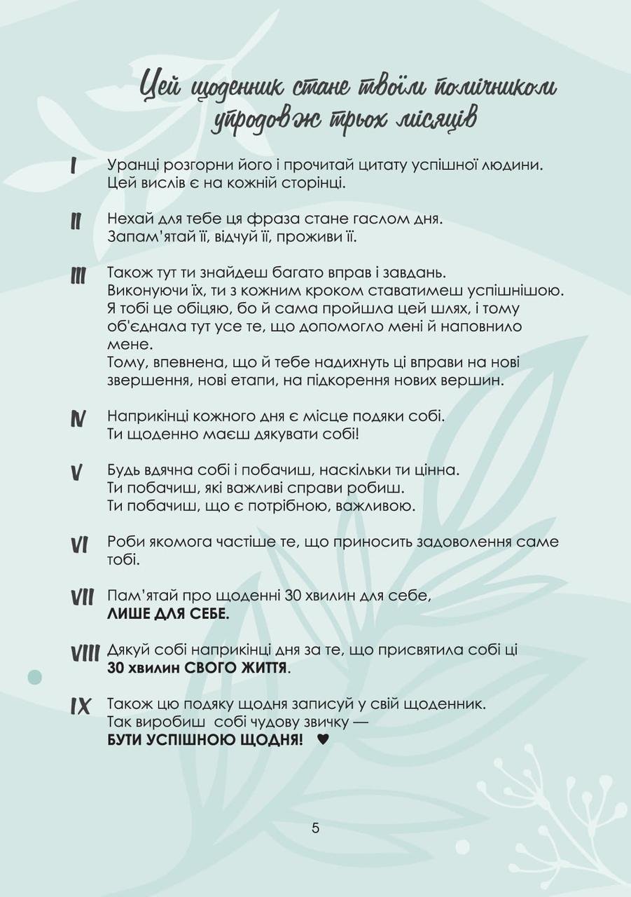 Мій успішний рік – це мотиваційний щоденник для жінок, які прагнуть бути щасливими та успішними. Це ефективний помічник, що сприятиме досягненню цієї мети. На елегантних нижніх квіткових сторінках описано завдання, виконуючи які ви станете кращою. Кожного наступного дня розпочинатиметься з мотиваційної цитати, яка вдихне на нові роздуми та висновки. Виконавши всі завдання у щоденнику, ви сформуєте найкращу звичку – бути щасливою щодня та досягати поставлених цілей.
