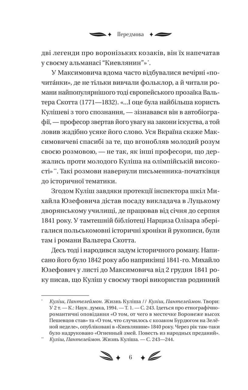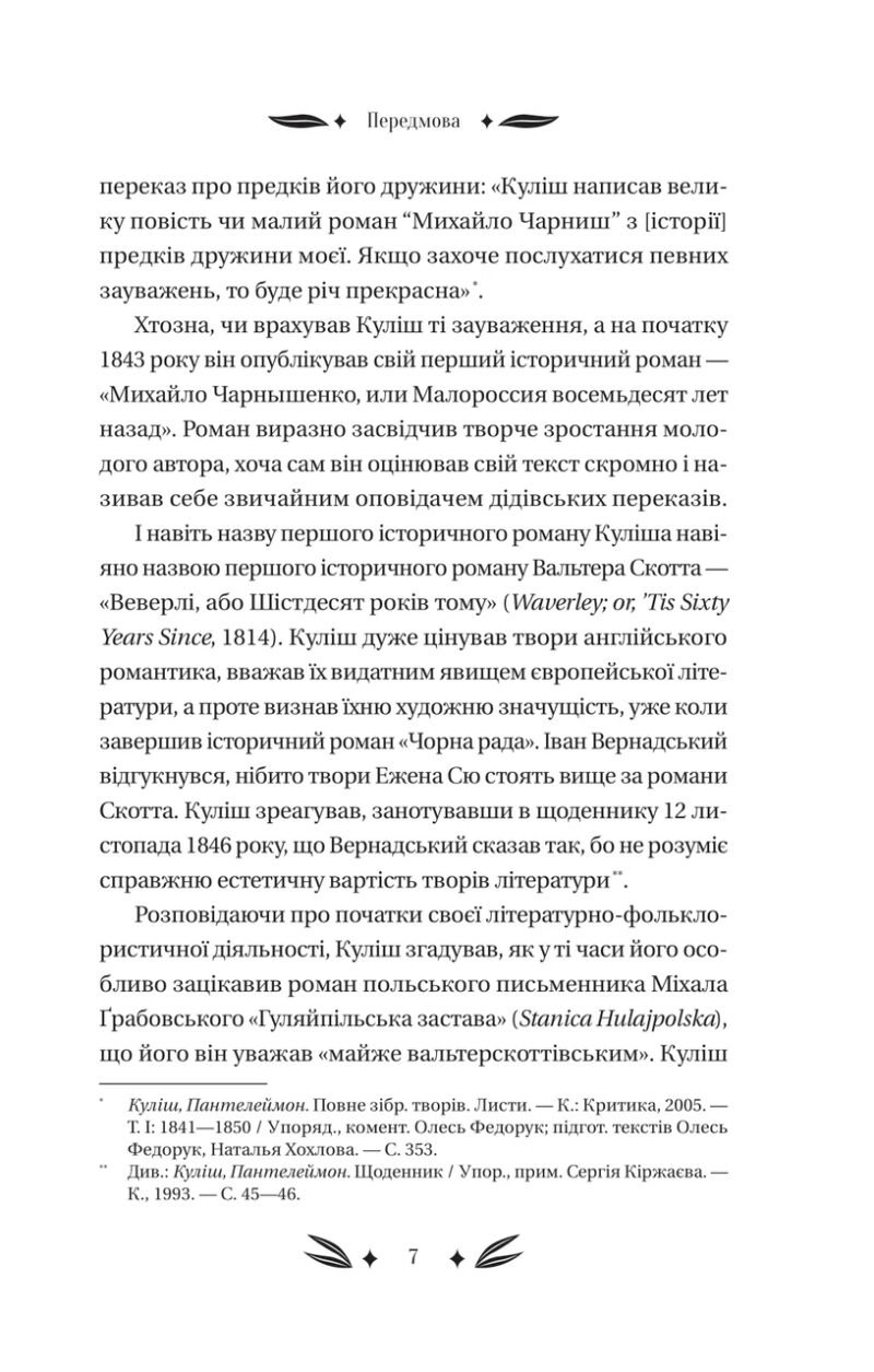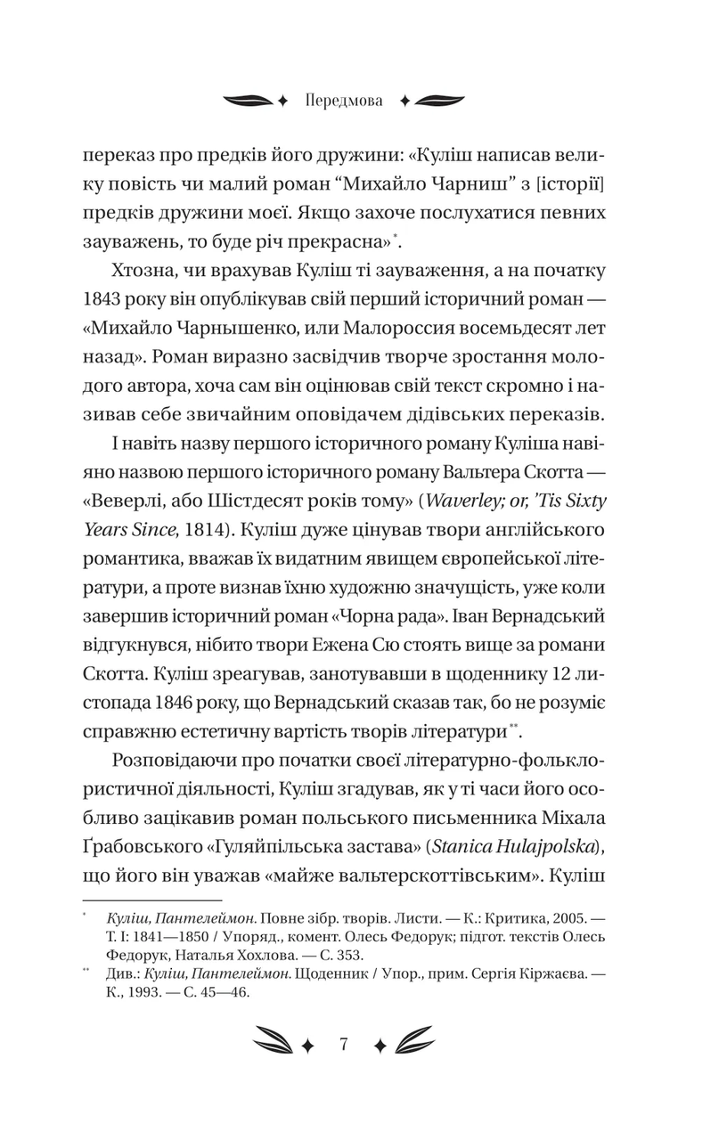 Пантелеймон Куліш написав свій перший роман у 23 роки. Молодий автор саме вивчав історію України і зачитувався творами Вальтера Скотта. Тому його «Михайло Чарнишенко, або Україна вісімдесят років тому» — це ще й перший український історичний пригодницький роман. Події відбуваються у другій половині ХVІІІ століття — години занепаду Гетьманщини. Звертання до минулого, напружена дія, гостра інтрига, романтичні уподобання, демонічні натури, безжальний вибір, що постає перед головним героєм, і сувора доля, яка карає тих, хто не шанує історії та традицій, — всі ці елементи «вальтерскоттівського» рецепту та дух романтизму, який панував у тогочасної культурі.