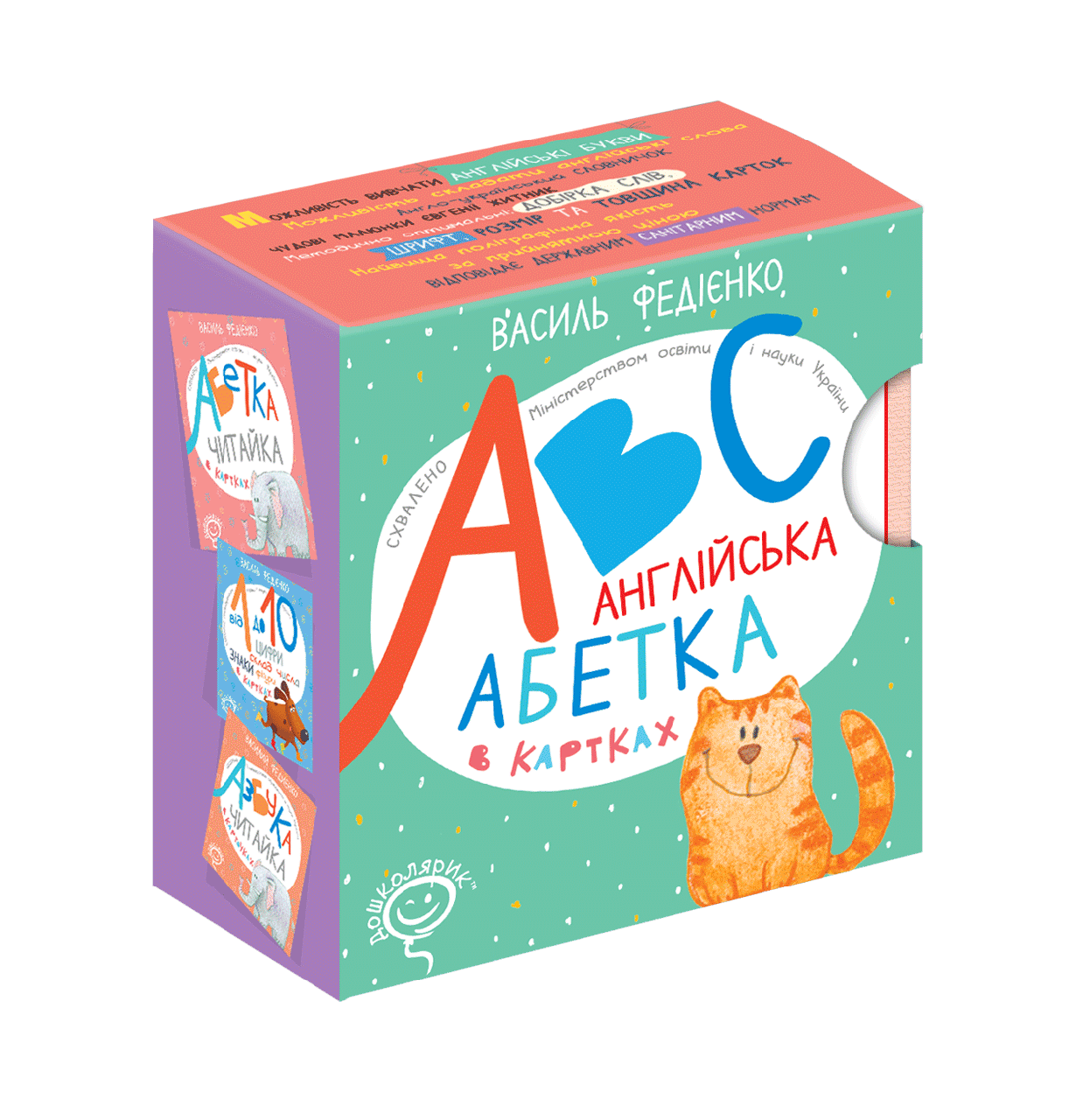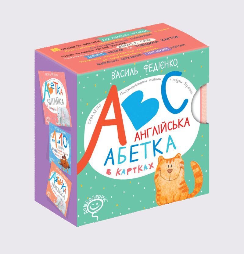 Запропонований комплект карток містить літери англійського алфавіту, слова та яскраві зображення предметів. З його допомогою можна в ігровій формі вчити англійську мову. А чудові малюнки сприятимуть кращому запам’ятовуванню та засвоєнню дітьми знань. Добірка слів, шрифт, розмір і товщина карток є методично оптимальними. Також комплект містить англо-український та англо-російський словарь.