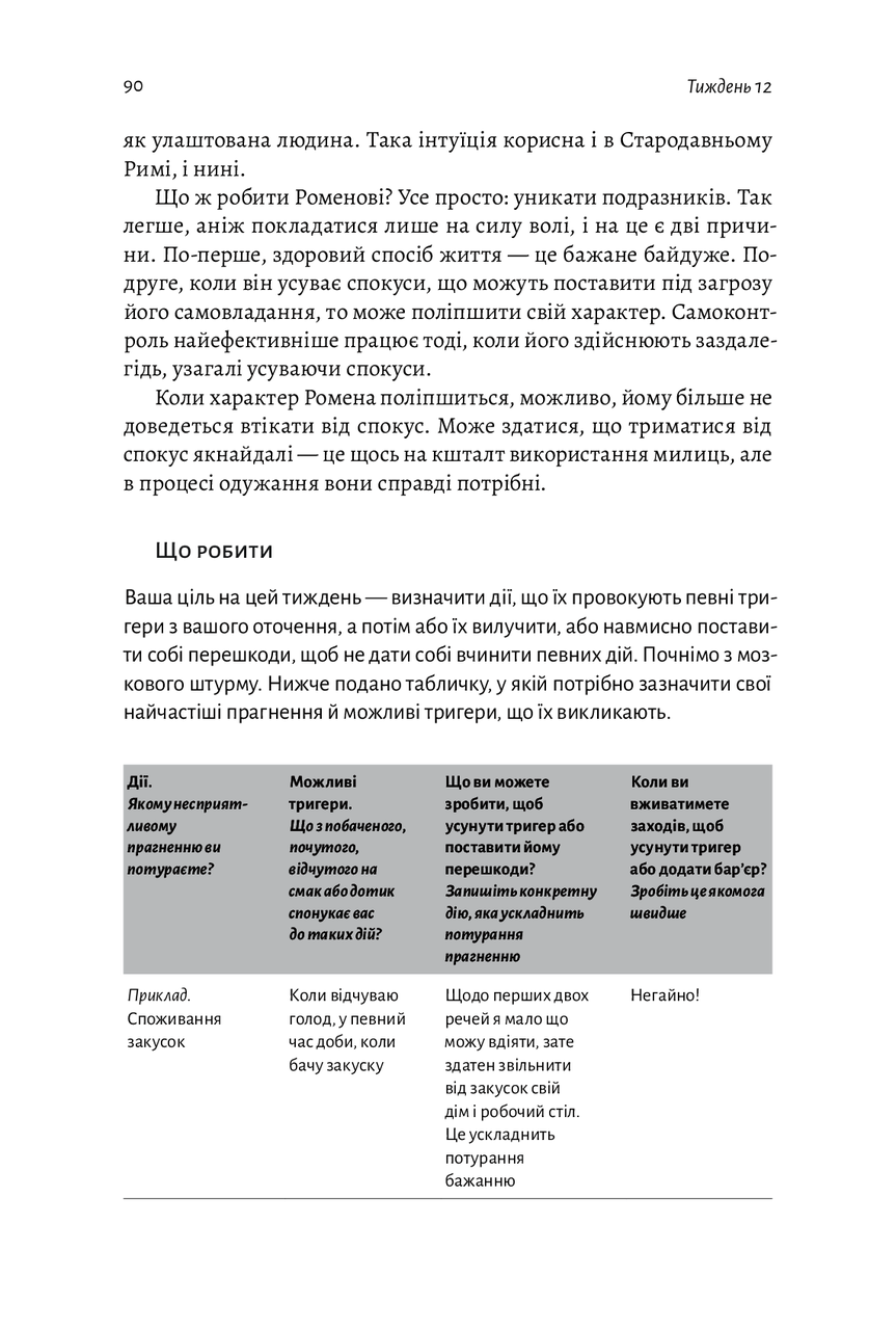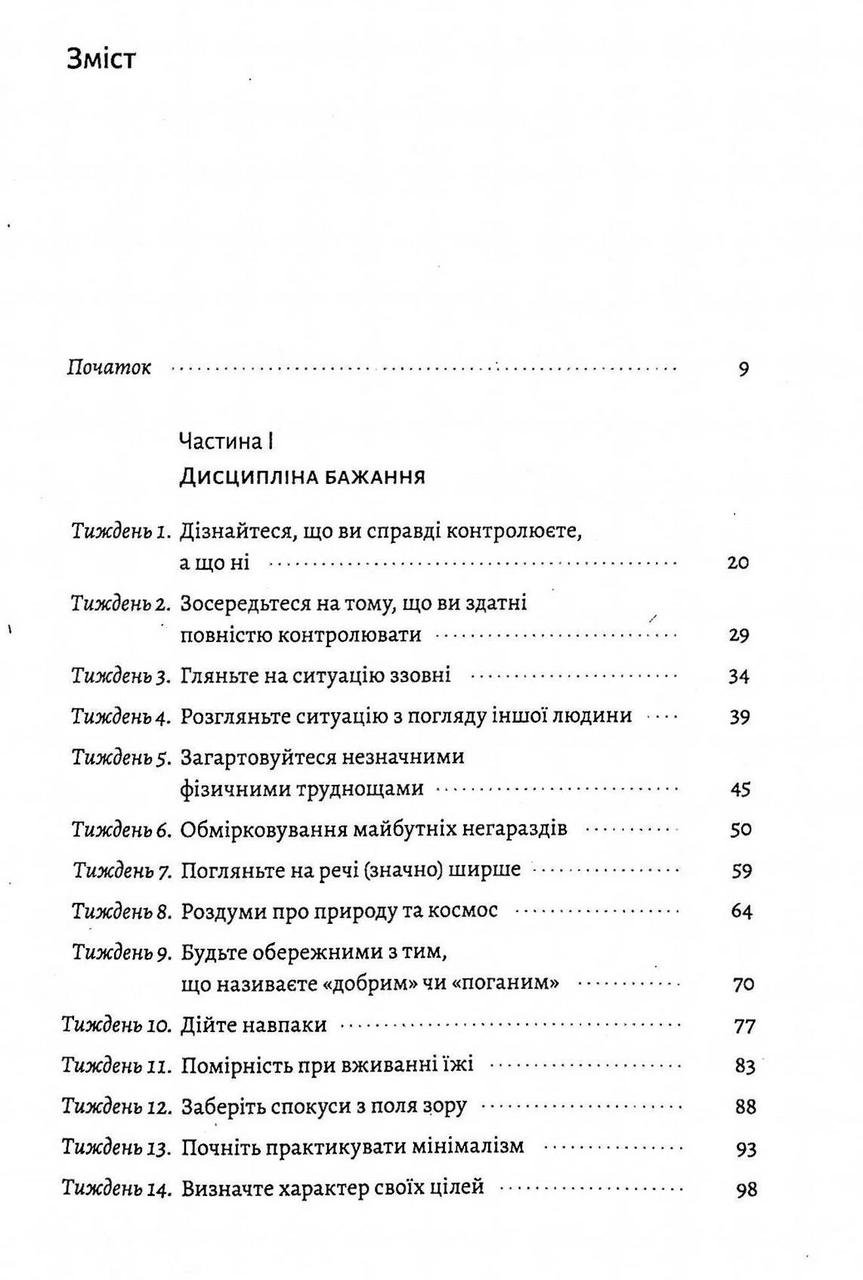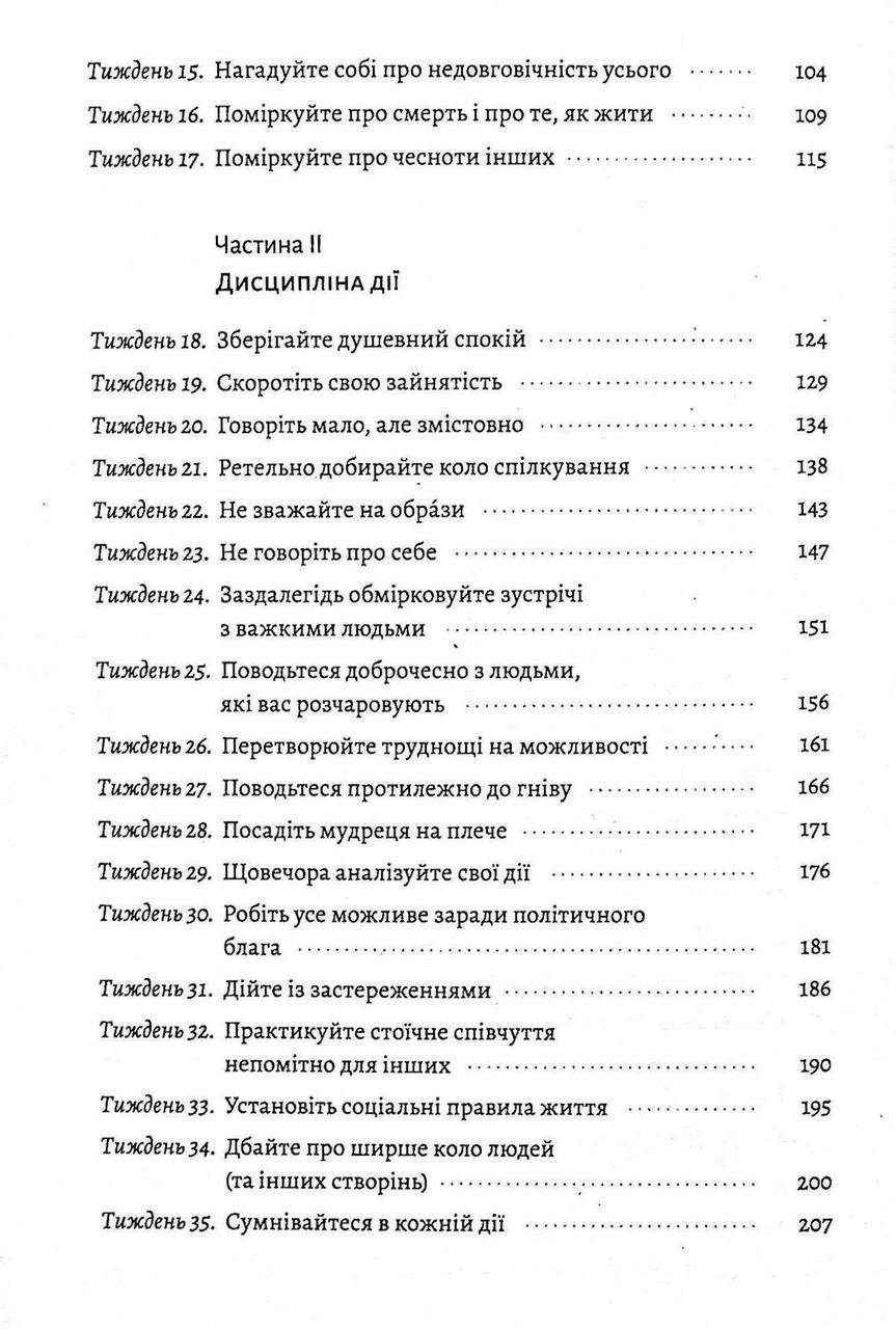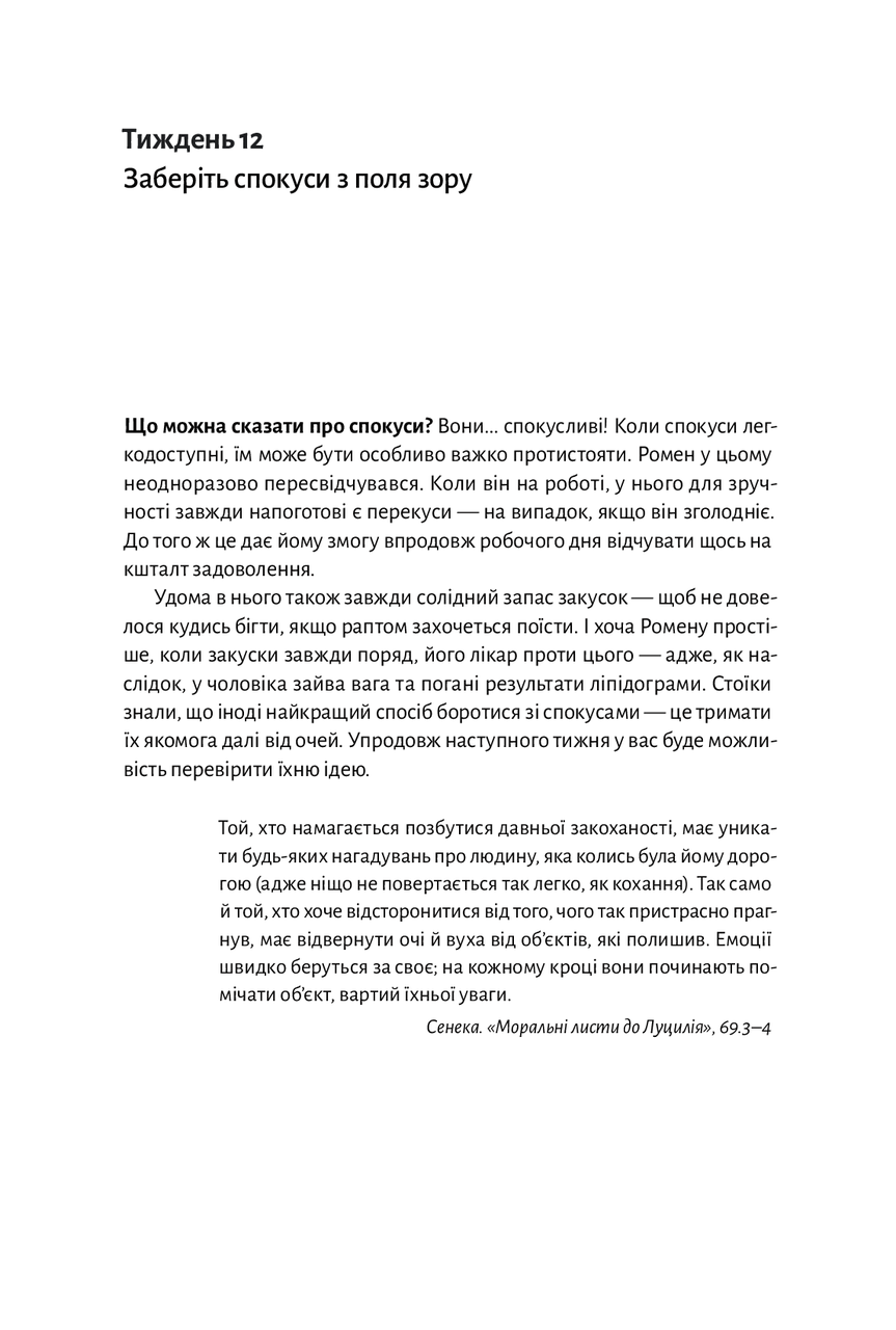 Книга про філософію стоїцизму — вчення, яке сьогодні набуває все більшої популярності. Античні стоїки вміли те, що багатьом із нас сьогодні не під силу — жити у гармонії із собою, підтримувати баланс у житті між матеріальним та духовним, не турбуватися через те, що неможливо змінити. Та, нарешті, всі вони були по-справжньому щасливими та насолоджувалися життям. У сучасному світі люди постійно кудись поспішають, живуть у постійному стресі та під тиском дедлайнів. Ця книжка — справжній практичний посібник зі змін свого життя на краще, розрахований на цілий рік (52 тижні). Вона не просто пояснює принципи стоїцизму, а ще й дає конкретні вправи, які допоможуть звільнитися від тяжкості психологічної напруги, осознати внутрішню силу та почати насолоджуватися моментом. Це книжка, яка створена не для читання, а для дій. Про авторів: Массімо Пільюччі — американський філософ, професор філософії в коледжі Леман, Міського університету Нью-Йорка. Є автором бестселлера «Як бути стоїком». Писавши статті для The New York Times та The Wall Street Journal. Ґреґорі Лопес — практикуючий світський буддист і стоїк. Засновник та фасилітатор зустрічі стоїків у Нью-Йорк, співзасновник організації The Stoic Fellowship, яка спрямована на підтримку та збільшення спільнот стоїків у всьому світі. Чим гарна ця книжка: Розкриває мудрість античної філософії простою та доступною мовою та пояснює, які її принципи ми всі можемо застосовувати у повсякденній житті; Дає чітко структурований 52-тижневий план, який допоможе назавжди змінити свою життя за допомогою простих щоденних вправ; Книга розбита на 3 розділи — дисципліну бажання, дії та згоди. Завдяки такому поділу у вас буде можливість досягти змін у різних сферах вашої життя, зокрема розвинути силу волі, характер та досягти омріяного “дзену” в особистій та професійній житті. Про хвилювання через незаплановані обставини: Хоч би скільки ми планували, хвилювалися і намагалися запобігти нещастям, вони іноді все одно стаються. І люди реагують на них дуже по-різному. Хтось не зважає, хтось завмирає, а в когось з’являються тривога та страх. Чому ми реагуємо по-різному? Стоїки припускають, що ті, хто потрапляє в обставини, яких бажає уникнути, — це люди, які страждають. Тобто вони вважають, що страждання часто спричиняються відмінністю між тим, чого нам хочеться і що відбувається насправді. Або, як сказали б стоїки, невідповідністю між тим, що згідне з природою, і тим, що суперечити їй. Про життя теперішнім: Не хвилюйтеся щодо майбутнього та не жалійте за минулим. Майбутнє ще не настало, а минуле вам непідвладне. Лише теперішнє вимагає вашої уваги — ви маєте ухвалювати важливі рішення щодо того, як плануєте провести цей день і щодня, в поточний момент. Навіть мудрі люди залежать від примх життя. Щоб притупити біль розчарування, вони формують обґрунтоване уявлення, що може статися, і уникають безпідставних мрій. Така здатність дає змогу виробити спокійне ставлення до життя. Стоїчна філософія привносити в нашу життя відчуття невідкладності, того, що потрібно витрачати час і ресурси лише на важливі речі, оскільки життя коротке і ми не знаємо, коли воно закінчиться.
