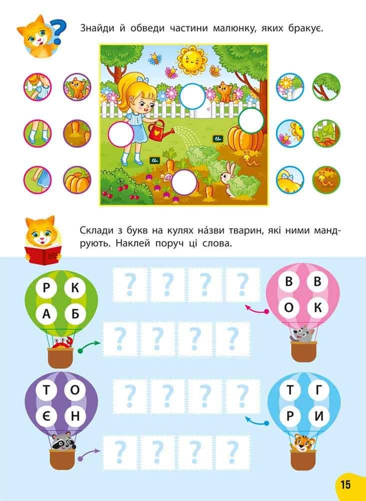 ВІДПОВІДАЄ БАЗОВОМУ КОМПОНЕНТУ ДОШКІЛЬНОЇ ОСВІТИ. Видання містить понад 150 різноманітних завдань, поданих в ігровій формі, та 230 наліпок для їх виконання. Завдання поділені за кількома напрямками: дрібна моторика, логічне мислення, увага та пам’ять, загальні знання про довкілля, розвиток мовлення, читання та цифра. Численні яскраві ілюстрації, кольорові наліпки та виконання завдань в ігровій формі полегшуватимуть сприйняття матеріалу та роблять процес навчання цікавим та захоплюючим. Книга стане незамінним помічником дорослим і забезпечує ефективне розвиток базових навичок малюкам.