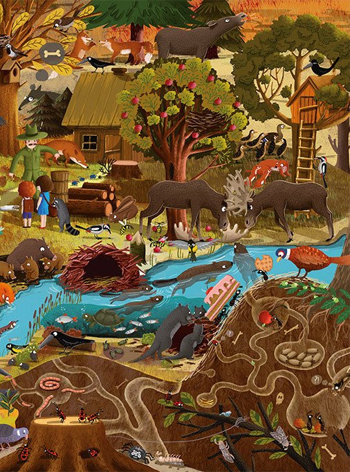 Рік у лісі — це дванадцять картин про дванадцять місяців одного року. Щомісяця — детально промальований «кадр» лісу зі всіма його мешканцями, зображеними в різних ситуаціях, за різної погоди, вдень чи вночі. На першому та останньому розворотах — презентація мешканців лісу та інтелектуальна гра. Ви дізнаєтеся про звички тварин: Хто де мешкає? Хто спит вдень, а хто вночі? Хто що їсть? Хто як готовиться до зими? Які звірята та птиці паруються на всю життя, а які — тільки на брачний період? Хто робить найкращі запаси, а хто є найбільшим лісовим лінюхом? Кого не застане зима? Хто та як довго опікується потомством? Відповіді ви знайдете на сторінках цієї незвичайної книги. «Рік у лісі» розвиває увагу і спостережливість, стимулює логічне мислення, пошук причинно-наслідкових зв’язків, вміння розповідати, а передусім — гарантує чудову розвагу на багато годин.