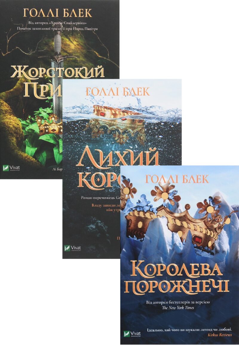 Трилогія Голлі Блек «Народ Повітря» — це захопливе занурення у світ «темного фентезі», де величні фейрі стають не добрими істотами з казок, а підступними, жорстокими та смертельно небезпечними створіннями. У центрі сюжету — смертна дівчина Джуд, яка після загибелі батьків змушена виживати в Ельфгеймі. Бути людиною серед фейрі означає щодня терпіти зневагу, але Джуд не збирається бути жертвою: вона вчитись бути такою ж гострою та нещадною, як і мечі її ворогів. У першій книжці, «Жорстокий принц», ми спостерігаємо за запеклим протистоянням Джуд та принца Кардана — розбещеного молодшого нащадка короля. Намагаючись вибороти собі місце під сонцем, дівчина опиняється в епіцентрі палацового перевороту. Її шлях — це шлях шпигунства, зрад та відчайдушних рішень, де ціною помилки є не лише власне життя, а й частка її сестер. Саме тут зароджується одна з найпопулярніших і найскладніших любовних ліній у сучасній літературі. Продовження історії, «Лихий король», підіймає ставки до максимуму. Джуд вдається зробити Кардана королем-маріонеткою, але влада — це тонка крига. Поки вона намагається маніпулювати кожним кроком правителя, навколо них плетиметься мережа нових замовлень та політичних інтриг. Найболючішим для Джуд стає усвідомлення, що жорстокий принц перетворився на лихого короля, чиї поступки стають дедалі непередбачуванішими навіть для тієї, хто тримає його за нитки. Фінал трилогії, «Королева порожнечі», розкриває головну істину: владу значно важче утримати, ніж захопити. Опинившись у вигнанні та втративши контроль над ситуацією, Джуд повинен ризикнути всім, щоб повернутися до Двору та врятувати свою сестру-близнючку. Коли стародавнє прокляття загрожує знищити весь Ельфгейм, героїні доводиться обирати між власною жадобою влади та людяністю, яка завжди була її слабкістю і водночас найбільшою силою.